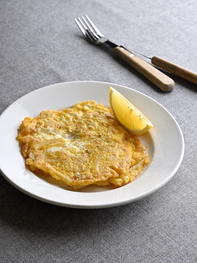 - フライパンにオリーブ油、バターのそれぞれ半量を弱めの中火で熱し、2の半量を流し入れて平たくし、こんがりするまで焼く。上下を返して同様に焼く。同様にもう1枚焼く。器に盛り、レモンを添える。
