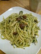 青しそで作ったジェノベーゼソースです。バジルよりも爽やかな香りがします。