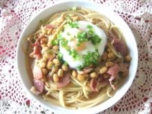 - フライパンにオリーブオイルとニンニクを温め ベーコンをソテーし、納豆と刻みネギを加え、 麺つゆとホワイトペッパーで味付け