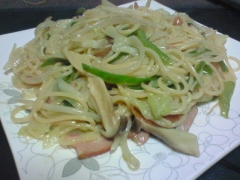 - そこに茹でたてたパスタを入れて、多少煮込んだら、水溶き片栗粉を入れて、トロみをつける。