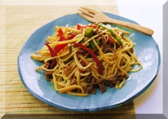 青椒肉絲を豆板醤でピリ辛に仕上げパスタにしました。