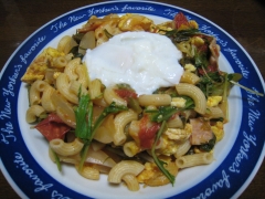 - ベーコンから油が出るので、油をあまり引くことはないと思いますが。もし、必要であればフライパンに油を引き1の材料を全て炒める。その際に、 卵も一緒に炒めホールトマト・ケチャップで味付けをして塩・胡椒で味を整える。