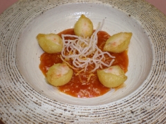 - 茹で上がったコンキリエの中に、えびのすり身をつめ、口を潰して閉じ、170℃の油できつね色になるまで揚げる。 春雨を揚げる。