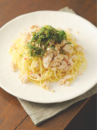 さっぱりとした鶏ひき肉と、ほどよい酸味の梅干しの風味でいただく和風ミートソースパスタ。たっぷりの青じその香りがさわやかです。梅干しの塩けによって、仕上げのゆで汁、塩の量は調節してください。