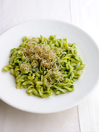 | 小松菜1/2束(100g)は塩少々を加えた湯でゆで、冷水にとる。水けをよくしぼってざく切りにする。ミキサーに小松菜と、オリーブ油1/2カップ、パルミジャーノチーズ20g、松の実大さじ1、塩小さじ1/3、こしょう、にんにく各少々を入れて、なめらかになるまでかくはんする。 |